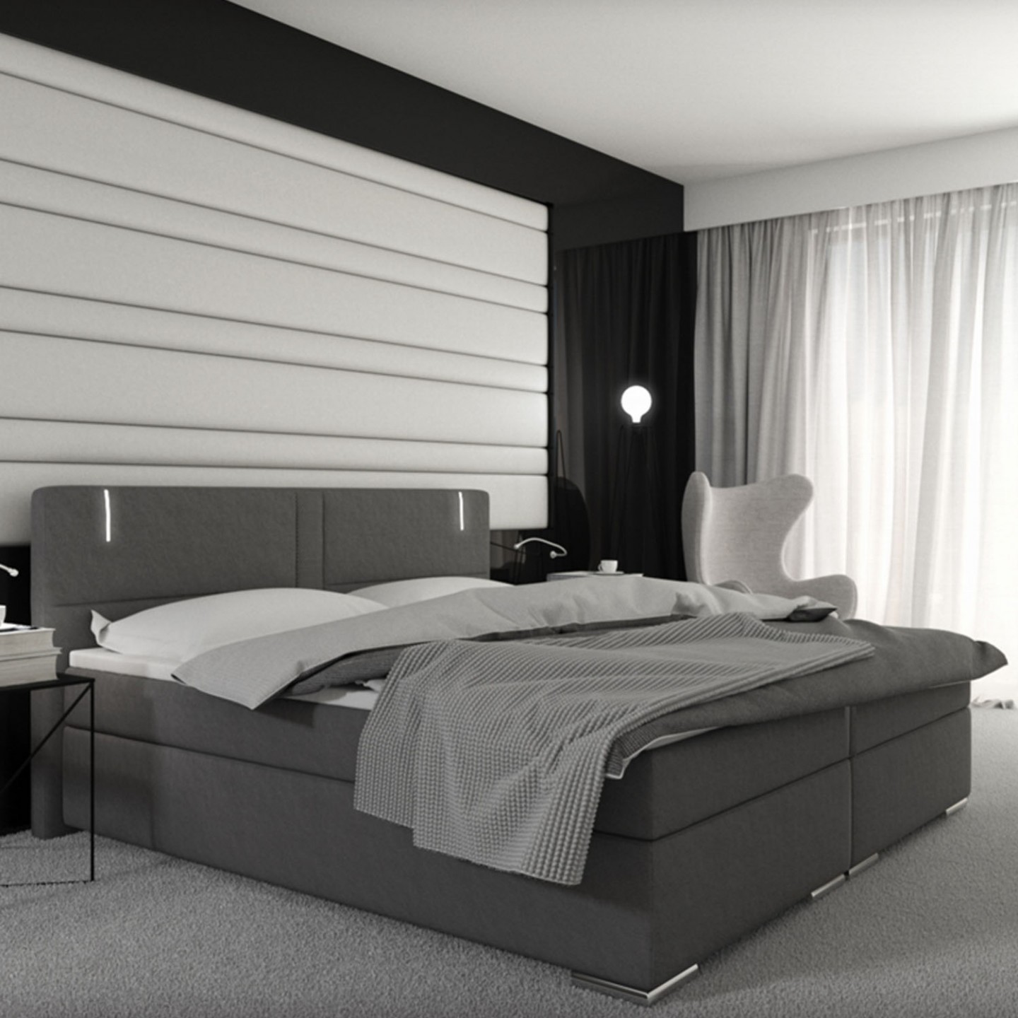Box Spring jsou vysoké americké postele, které přinesou do Vaší ložnice komfort a luxus a dopřejí Vašemu tělu ideální prostředí pro kvalitní odpočinek. Luxusní postel je složena ze dvou pevných postelí, dvou pružinových matrací Bonell a vrchního topperu. Dominantou postele je vysoké prošívané čelo s LED osvětlením. Hlavní výhodou tohoto lůžka je nezávislost jedné spící osoby na druhé, v případě pohybu osoby na jedné posteli nedochází k nežádoucímu pohybu osoby na posteli druhé. Obě postele jsou spojené pouze vrchním topperem a nedochází tedy k vzájemnému ovlivnění spacích ploch.