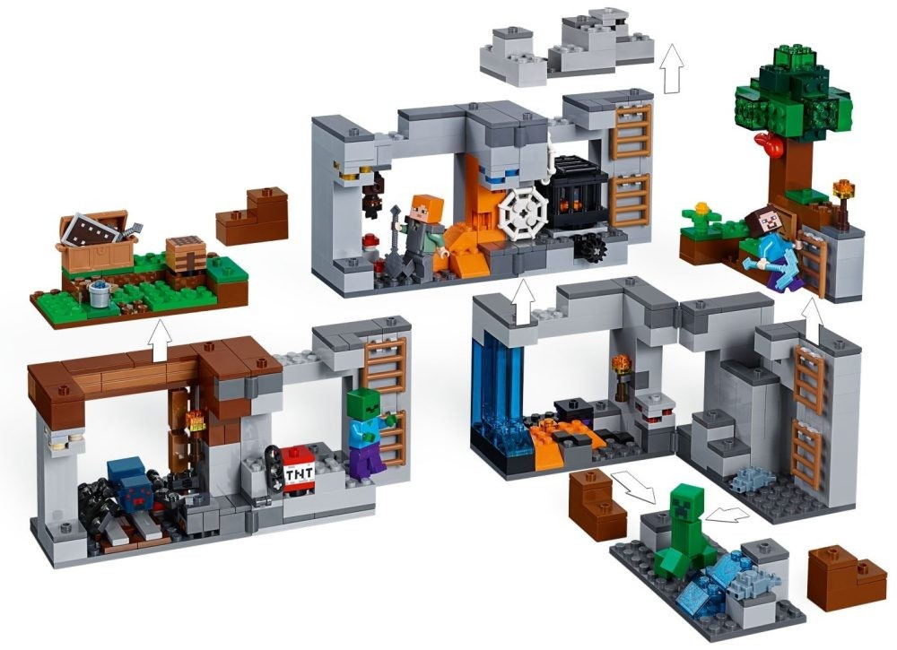 Sestupuj po žebřících do hlubin světa Minecraft™ s touto sadou 21147 Skalní dobrodružství od LEGO® Minecraft. Použij diamantový krumpáč nebo aktivuj funkci dynamitu k těžbě obsidiánu a 7 druhů rudy, a vydej se do jeskyní a dolů s vodou a lávopády. Bojuj s celou řadou nepřátelských příšer, včetně jeskynního pavouka, zombie, Creepera a rybenek! Užij si spoustu Minecraft™ dobrodružství s touto sadou z kolekce LEGO® Minecraft, která byla vytvořena speciálně pro fanoušky této velmi úspěšné videohry. Jednotlivé modulární části můžeš snadno různě kombinovat. Spoj tuto sadu s dalšími stavebnicemi a vytvoř si vlastní svět LEGO Minecraft. Součástí jsou minifigurky Alex a Stevea, a navíc figurka netopýra.