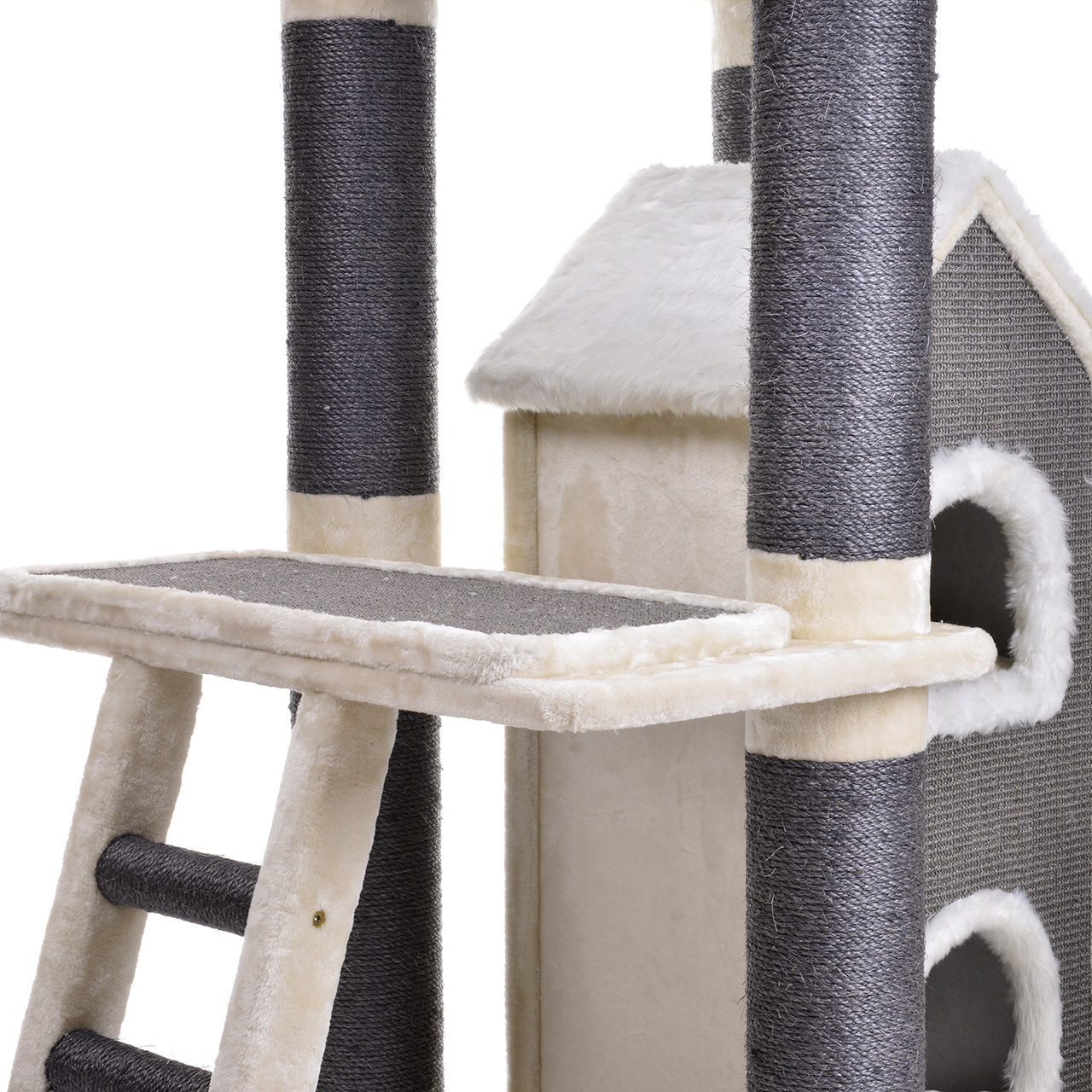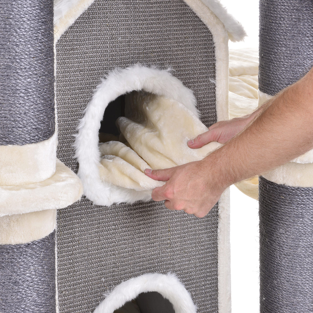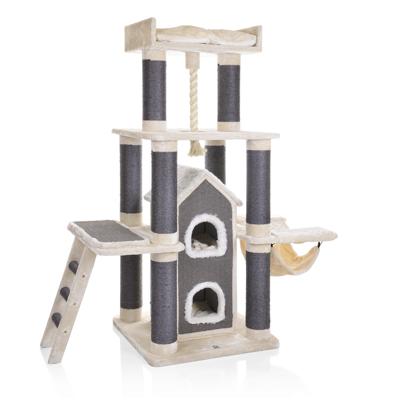 Členitost stromu nabízí mnoho možností, jak se kočičky mohou zabavit, nebo si naopak odpočinout a prospat. Pro jejich klidný a ničím nerušený spánek je součástí tohoto kočičího stromu velká spací jeskyně, která má dvě samostatné úrovně, uvnitř se tedy může prospat vícero koček najednou. V případě, že by je omrzelo škrábání o mohutné sisalové sloupy, mohou si svoje drápky hravě obrousit z horní plyšové základny o houpací sisalové lano. V boku zavěšená houpací síť bude určitě neméně využívána. Na nejvyšším místě je umístěna velká plyšová a velice pohodlná kočičí postel, ideální na příjemné lenošení i zajímavé pozorování území kolem. Nemalou výhodou této postýlky je její snadná údržba, lůžko lze snadno vyjmout, vyčistit a kočička mezitím může odpočívat na jeho měkkém polstrovaném rámu.