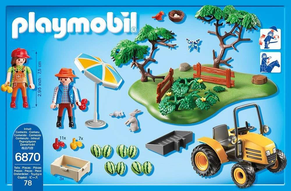 Set obsahuje malý sad se 2 ovocnými stromy a keři s melouny, farmáře a farmářku, traktor s radlicí, slunečník a další doplňky.