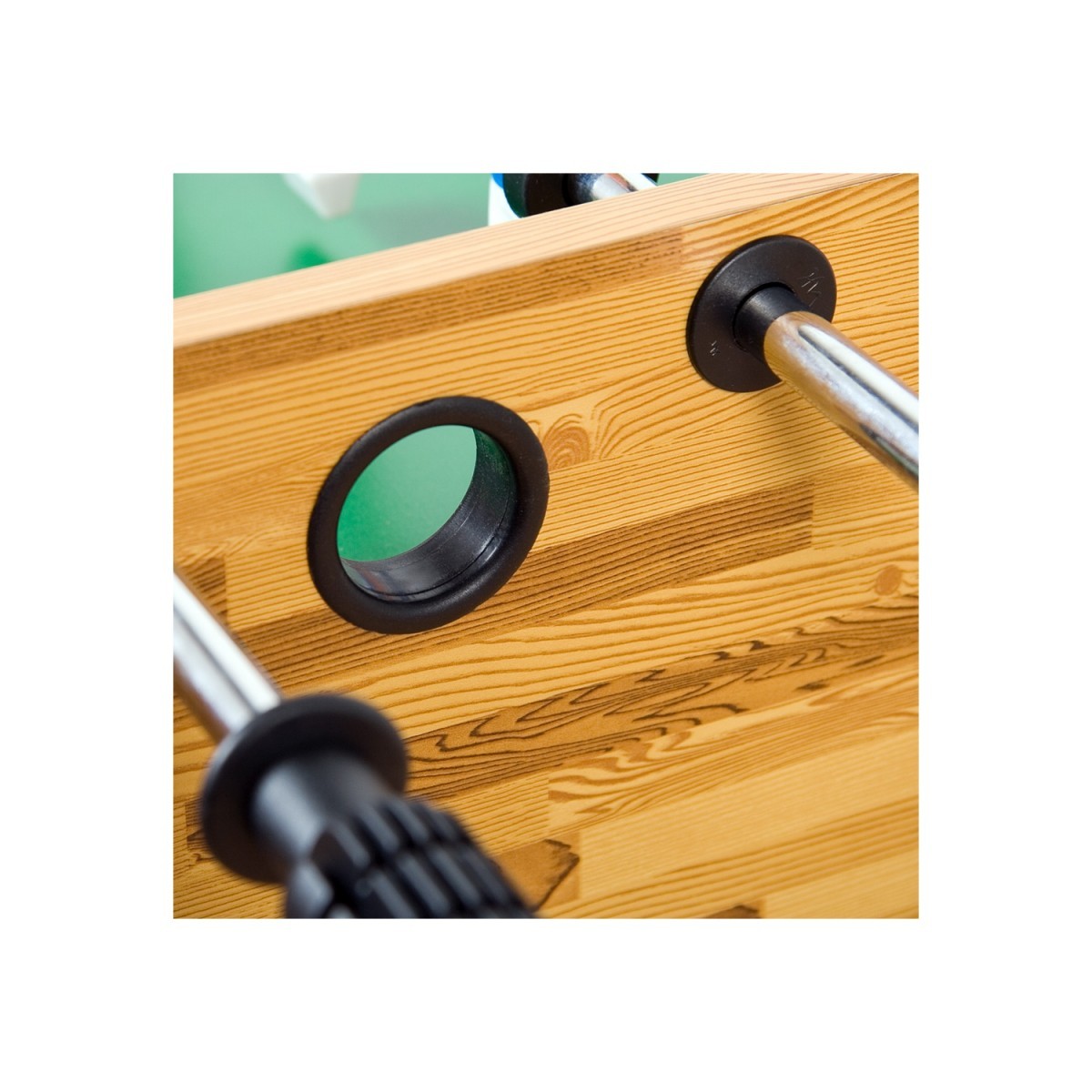 Stolní fotbálek je vyroben z MDF, pokrytý vrstvou laminátu, čímž je odolný proti otěru.Hrací plocha je vyztužená zespodu dvěmi příčnými tyčemi, které výrazně zlepšují jejich stabilitu a trvanlivost. Otvory na zadní straně usnadňují vytáhnutí míče po vstřelení branky. Fotbálek má nastavitelné nohy, vysoce kvalitní pogumované rukojeti a praktický držák nápojů. Zkosené vyvýšené rohy hrací plochy díky kterým míček nemůže uvíznout v rozích a vy si užijete plynulou akční hru.