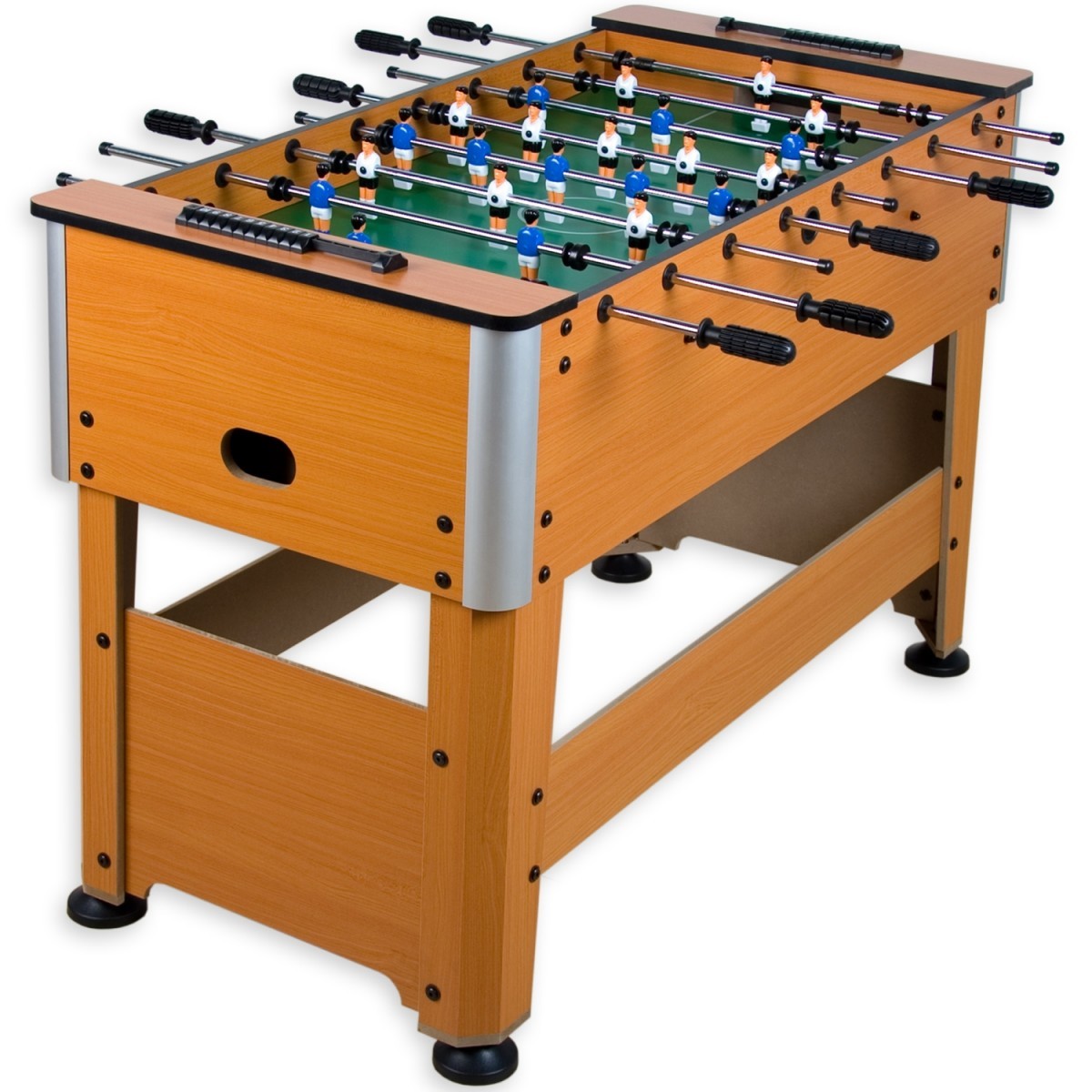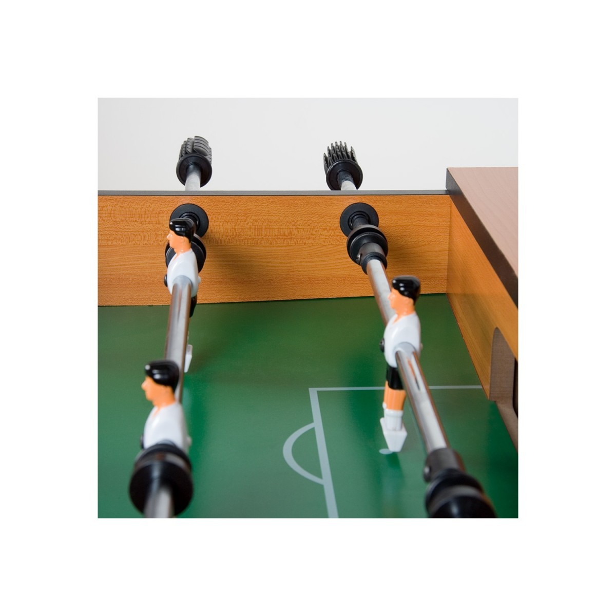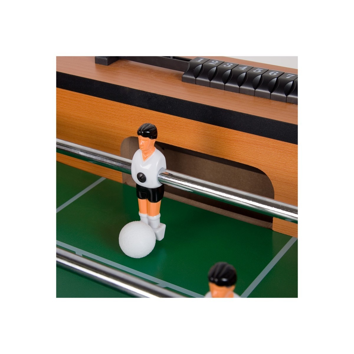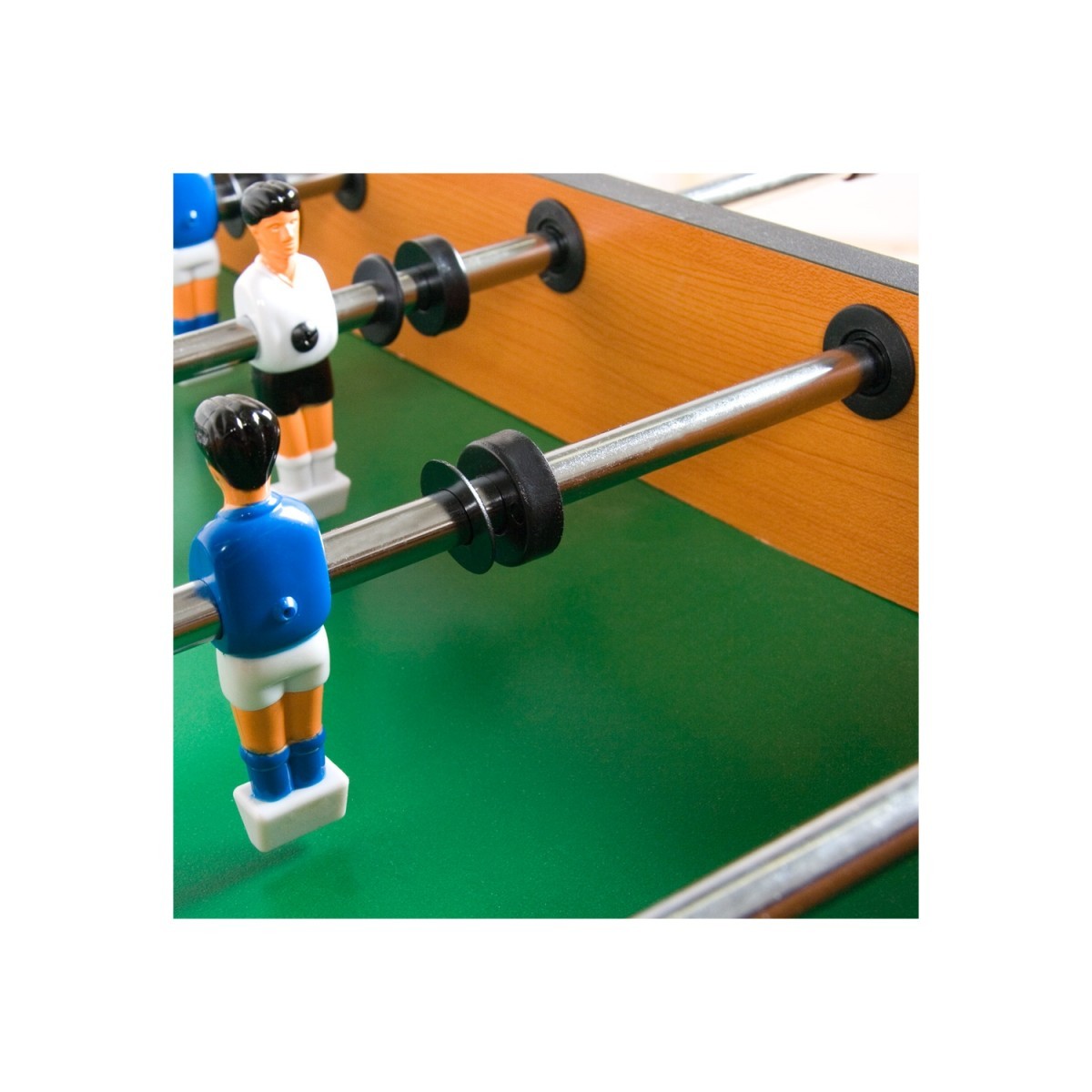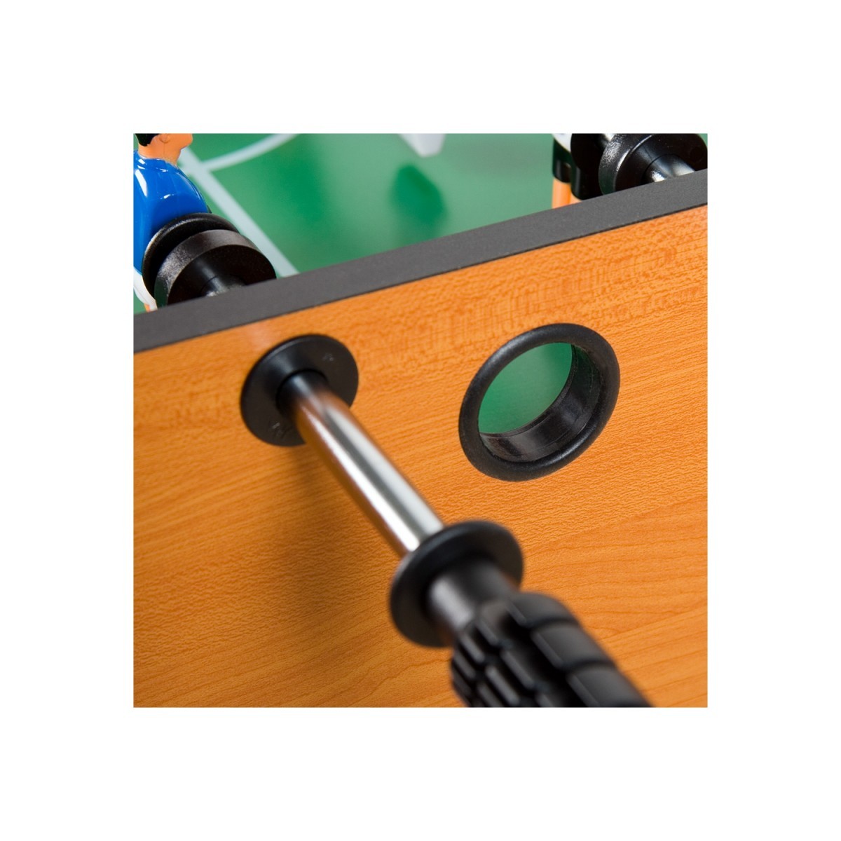 Stolní fotbálek je vyroben z MDF. Má protiskluzové rukojeti, zaoblené kovové rohy, chránící před opotřebením a šroubované malované figurky. Zkosené vyvýšené rohy hrací plochy díky kterým míček nemůže uvíznout v rozích a vy si užijete plynulou akční hru.