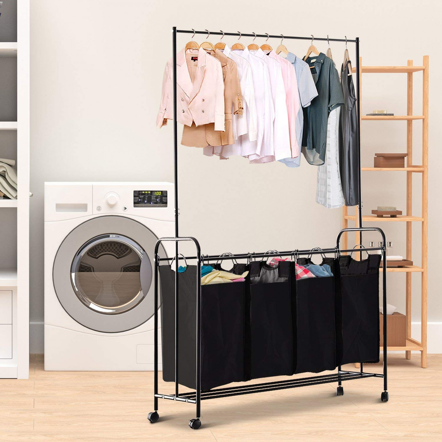 - Vybaveno 4 samostatnými pytlemi na prádlo s kovovými rukojeťmi